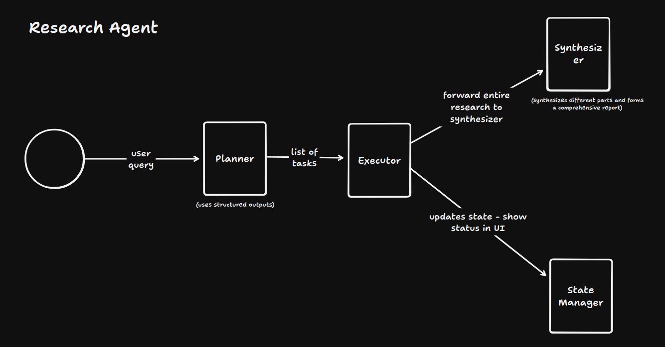 Each node can be an Agent in itself, or a single AI call. Each individual component completes one step of the entire task, and as a whole generates the desired result. The nodes can be a Planner component, that plans the tasks required to successfully complete the user's query, an Executor component that iteratively executes those tasks, a Connector component that connects with third-party services if required, a Logger, a Synthesizer, or anything else. The key is, unlike traditional systems where explicit conditioning is required using if-elses for each scenarios, these components work together with a shared context and take autonomous decisions to complete a given task.